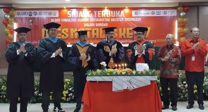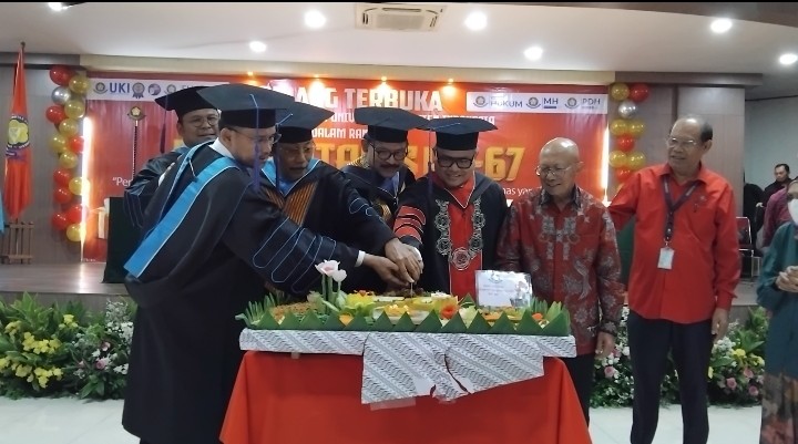 Tampak hadir pada Dies Natalis ke-67, Thomas Tampubolon (Pengurus Yayasan UKI), Prof. Dr. Dhaniswara K. Harjono (Rektor UKI), DR. Hulman Panjaitan (Wakil Rektor), Prof. Dr. John Pieris (Guru Besar Hukum Tata Negara UKI), Dr. Jimmy Simanjuntak (Ketua Senat FH UKI), Dr. Tomson Situmeang, (Wakil Dekan), dan lainnya. (lian)
