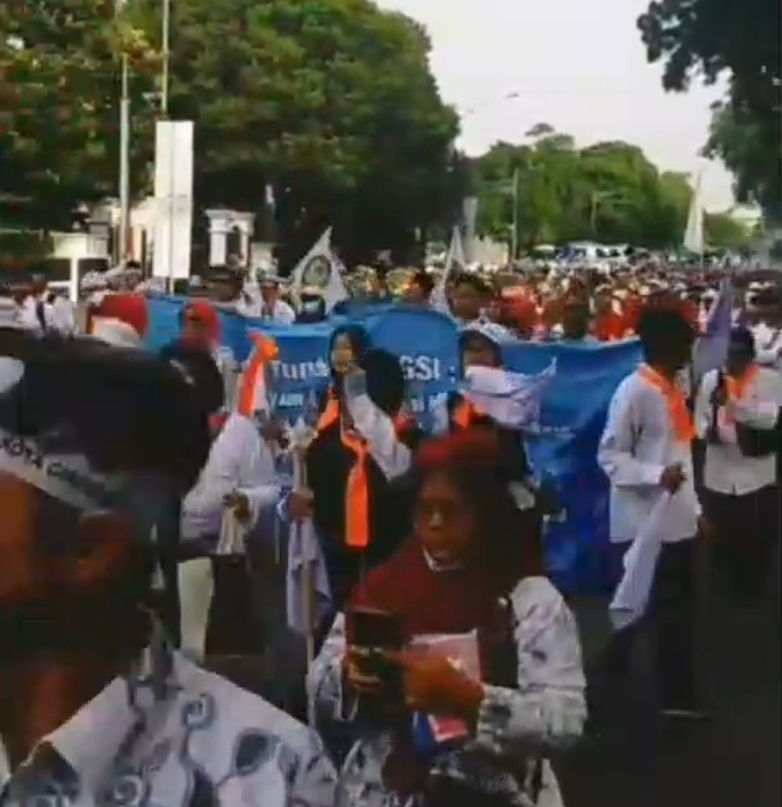 Di tengah kerumunan, lagu Hymne Guru bergema. Beberapa peserta tampak menitikkan air mata – bukan sekadar karena kelelahan, melainkan karena getirnya perjuangan panjang menuntut pengakuan yang tak kunjung datang.