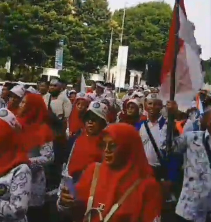 Di tengah kerumunan, lagu Hymne Guru bergema. Beberapa peserta tampak menitikkan air mata – bukan sekadar karena kelelahan, melainkan karena getirnya perjuangan panjang menuntut pengakuan yang tak kunjung datang.