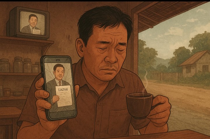 Pagi itu, berita datang lebih dulu daripada pelanggan. Di layar televisi kecil yang digantung di atas etalase, wajah seorang pejabat muncul. Ia tersenyum lebar sambil memamerkan ijazahnya. Wartawan berkerumun, mikrofon bertumpuk seperti jarum mengarah ke satu wajah.